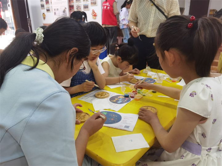 6月14日,市博物院开展掐丝珐琅与家风传承活动。图为孩子们在给掐丝珐琅杯垫涂色。(丽江融媒记者 段玉菊 摄)