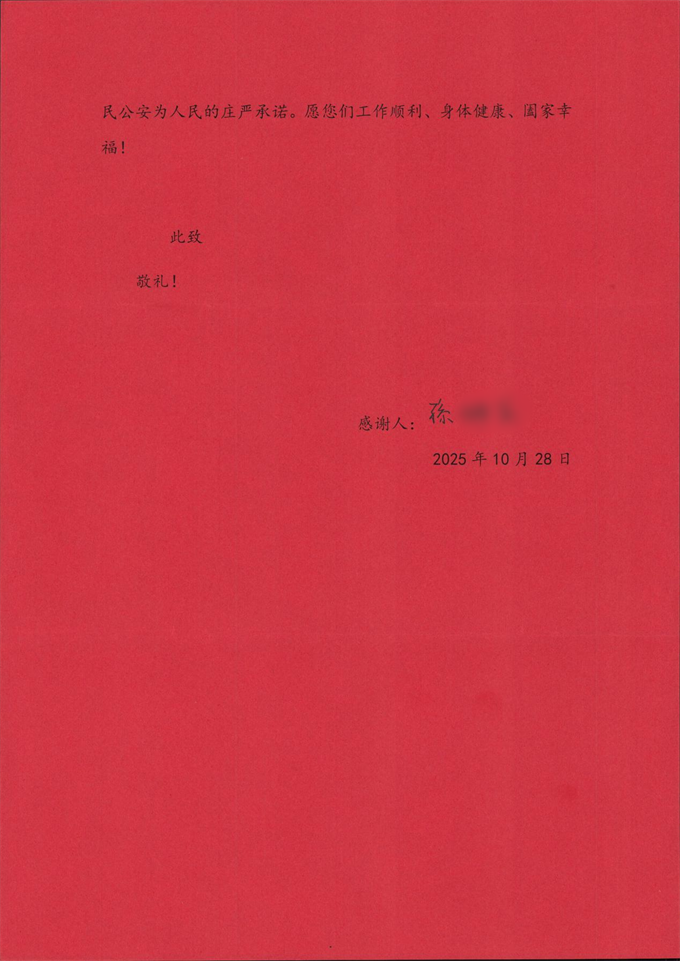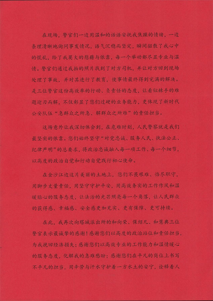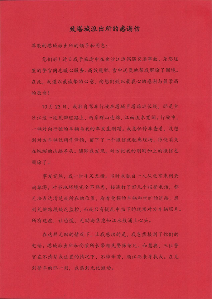 近日,玉龙县公安局塔城派出所民辅警收到了一份来自千里之外的特殊包裹,包裹中除了一面书写着“金沙江上扬正气,感谢塔城好警察”的锦旗,自驾游客孙某某还用一封情真意切的感谢信,讲述了锦旗背后温暖与认可双向奔赴的暖心故事。