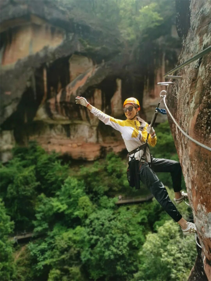 攀岩爱好者在黎明老君山丹霞岩壁上。(供图)
