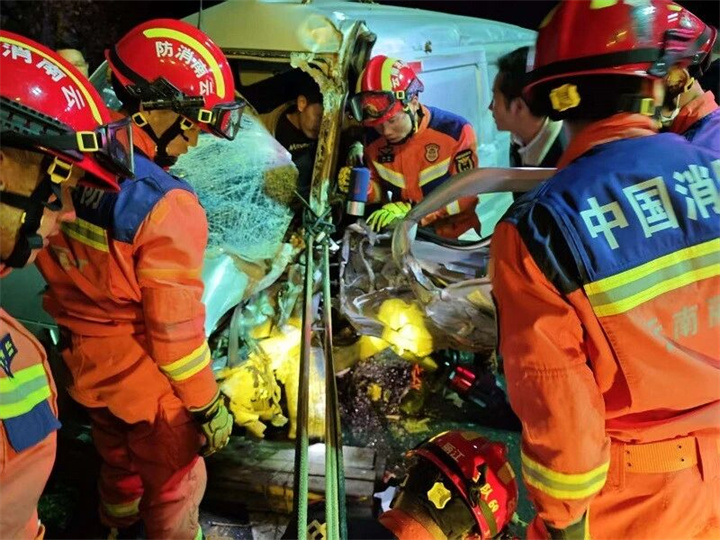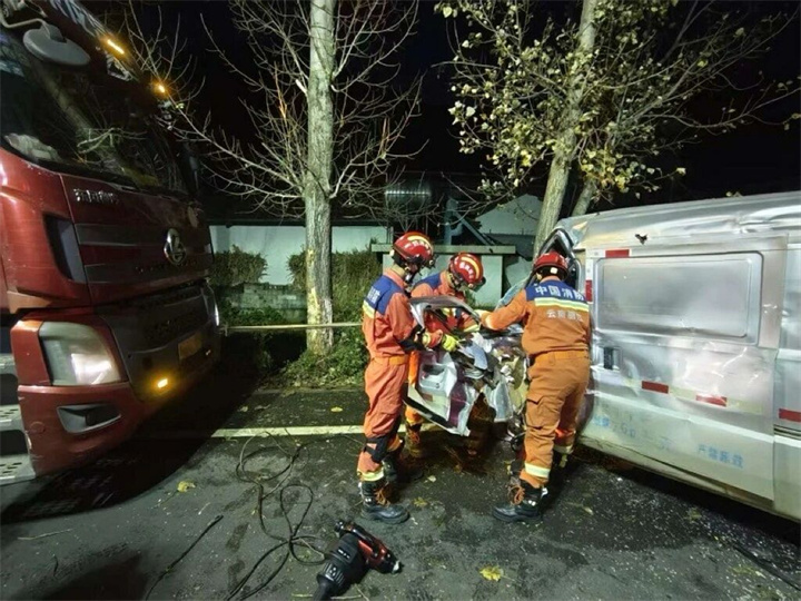 根据现场情况,指挥员立即制定救援方案:一组人员利用液压破拆工具组对驾驶室车门及变形框架进行扩张、剪切,逐步扩大救援空间;另一组人员协助稳定车辆,防止二次位移,并全程安抚被困人员情绪,配合医护人员做好急救准备。经过近30分钟紧张有序的处置,两名被困人员被成功救出,并迅速移交现场120急救人员送往医院救治。