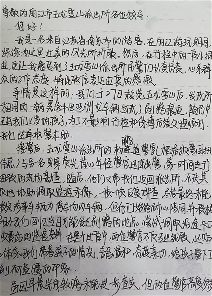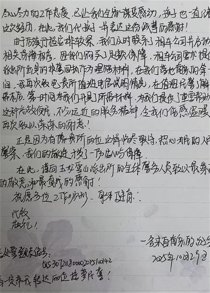 “不仅专业细致,还贴心体谅我们带着孩子的情况,温和亲切的态度,给孩子留下了深刻而温暖的印象……”近日,江苏南京游客手写感谢信感谢玉龙雪山派出所民警。据悉该游客一家在游览玉龙雪山景区景点结束后,发现所租用车辆有被剐蹭的痕迹后报警求助,在民警的帮助下顺利理赔,该游客和家人真切感受到了玉龙雪山派出所民辅警的高效服务与人文温暖。