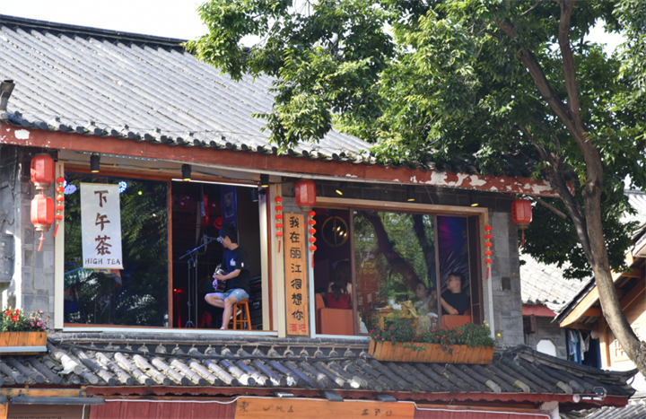 转角处的小酒馆里,民谣歌手即兴弹奏的吉他声,与流水声、风声相和。过路的游人不由自主地放慢脚步,任由悠扬的旋律将自己带入歌手编织的故事中。这并非精心编排的演出,而是生活本身在纵情放歌,亦是丽江古城的日常写照。