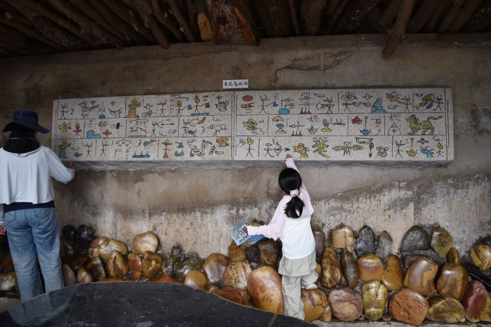 游客在美鲁纳西村文字走廊欣赏东巴象形文字。(丽江融媒记者 段玉菊 摄)