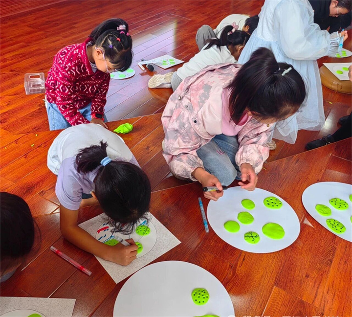 绘本故事结束后,小朋友们在周荣老师的指导下,迫不及待地投入到手工制作“莲蓬”的环节中。他们用灵巧的小手,运用卡纸将绿色的黏土变成莲蓬,再用红色的黏土捏成小鱼,画上水池。不一会儿,一个个形态各异、充满童趣的“莲蓬”就在小朋友们手中诞生了。