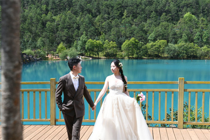 一对新人在蓝月谷景区拍摄照片。(丽江融媒记者 赵庆祖 摄)