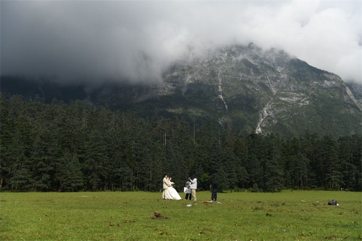 在云杉坪景区拍婚纱照的新人。(丽江融媒记者 赵庆祖 摄)