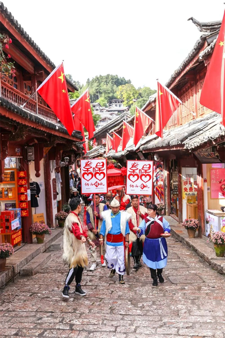在丽江,就有这样一家深耕纳西传统民俗非遗的企业——喜鹤民俗文化有限公司。公司以弘扬民族文化为己任,专注于纳西族传统婚俗的传承展示与创新发展。自成立以来,已承办2000余场纳西婚礼,其中超 50% 的参与者为海外游客 —— 他们格外钟情丽江传统文化,不少来自新加坡、西班牙等国家的新人,会穿上纳西族服饰,亲身参与跨火盆、喝糖茶等迎亲仪式,沉浸式感受这份独有的 “中式浪漫”。