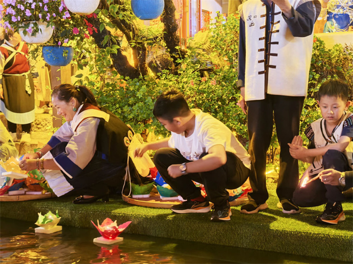 大研街道宣传委员牛珝莹说:“我们根据丽江大研古城的水系分布,分别在大水车和中西东河设置了4个河灯投放点。放河灯既是丽江古城居民的传统习俗,也是游客期待的文化体验项目之一。这一习俗不仅承载着祭祀祖先的意义,更延伸出浪漫与感恩的文化内涵,尽显优秀传统文化的生命力与创造力。”