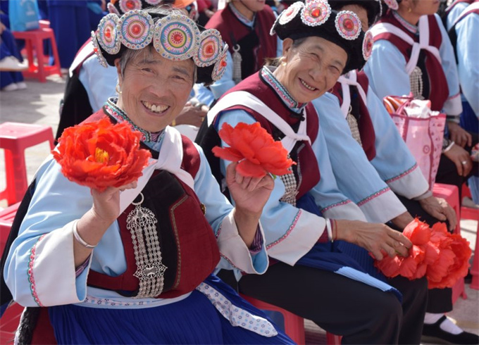 活动现场,老人们手拿表演用的花朵,脸上绽放着幸福的笑容。(丽江融媒记者 段玉菊 摄)